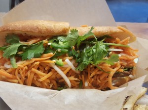 For those who have never had a bánh mì, I’m so sorry. For those who have, you are probably scoffing at the hip choice of sandwich spot for this bánh mì. “A bánh mì over $5 is ridiculous.” “The gentrification of sandwiches?! Where does it stop?” All fair points and valid questions. The true spirit of the sandwich is modest and delicious. Take a day old baguette (the bread should be a wee crusty), load it with marinated meat, carrots and radishes, cucumbers, cilantro, and some jalepeños. I ordered the lemongrass pork as I was tempted by the garlic mayo (I’m a slut for garlic mayo). It looked like a ton of carrots and daikon when it came out, but I had no complaints once I started eating. They were delicious.
