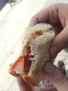 I went with the tuna and avocado (which put me back probably $4) and was also tempted by a nearby table with more sandwich selections. However, each of these were all the same peanut butter and jelly sandwich on cinnamon challah with halved strawberries inside. This little guy is the best taste for value sandwich I’ve had so far. Two bucks took me to sticky sweet bliss. I’m forever in debt to the Jews that have pushed the deli sandwich to what it is today, but this time it was the squishy cinnamon challah that got me, pausing only to take this picture before demolishing the rest in one bite.