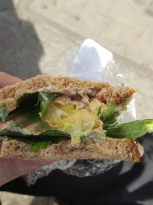 Courtney’s Produce is a small fresh produce corner store on Castro street. They are a cash only business that specializes in fresh picked fruits and veggies and fresh squeezed juices, as their main sign advertises. Those who frequent Courtney’s know that in a small refrigerated shelf with a wooden handwritten sign there is an abundance of sandwiches to grab and go. The sandwiches are pre-made with options like tuna, BLT, turkey, etc. All come with fresh cut veggies on good wheat bread, and I didn’t see a single sandwich on the board that costed more than $4.50.