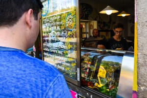 When we stepped into the shop, it was already full to bursting with customers. There were dozens of ingredients behind the counter, trays of raw meat in appealing looking marinades that would be fire grilled to order, and hurried young employees running cash to the register and ingredients to sandwiches. When it was my turn, I quickly threw out my order in my busted Spanish and watched the cook scoop two healthy servings of meat for our sandwiches from the trays and head to the back corner where the flame grill waited. Quickly, I stepped outside so the folks ahead of me could pay and I could get my ass out of the faces of the customers seated and eating at the tables near the order counter.
