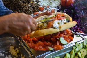 To be honest, I have no idea what went inside exactly. In addition to our steaming chicken and beef, I saw a flurry of cucumbers, peppers, lettuce, tomato, cabbage, onion, olives (which I usually avoid, but they were Spanish olives and absolutely necessary here), feta-like cheese, and at least three delicious sauces that were creamy and generously applied.